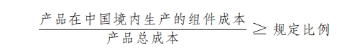 產(chǎn)品在中國境內(nèi)生產(chǎn)的組件成本占比應(yīng)當(dāng)達(dá)到規(guī)定比例,計(jì)算公式為: