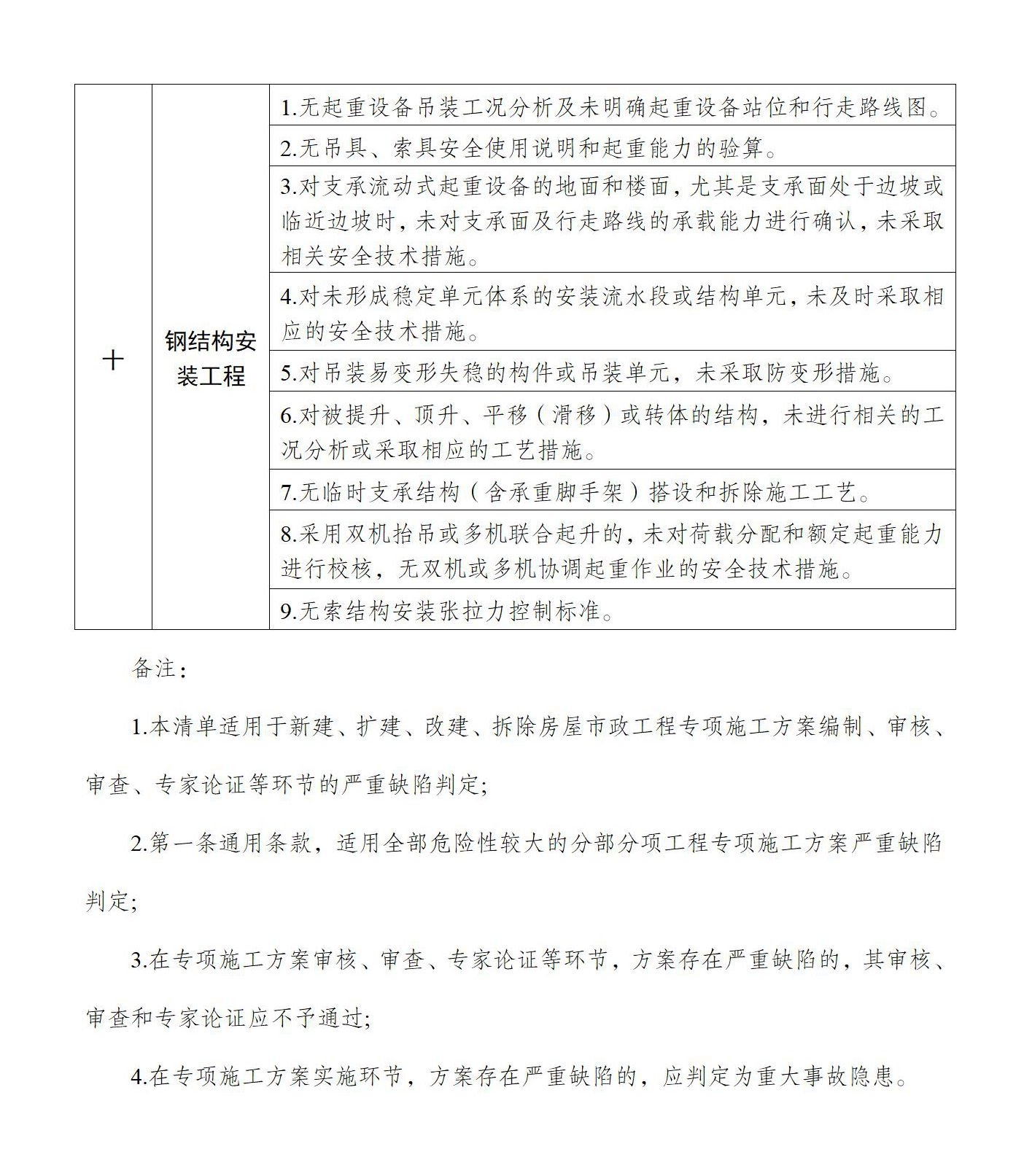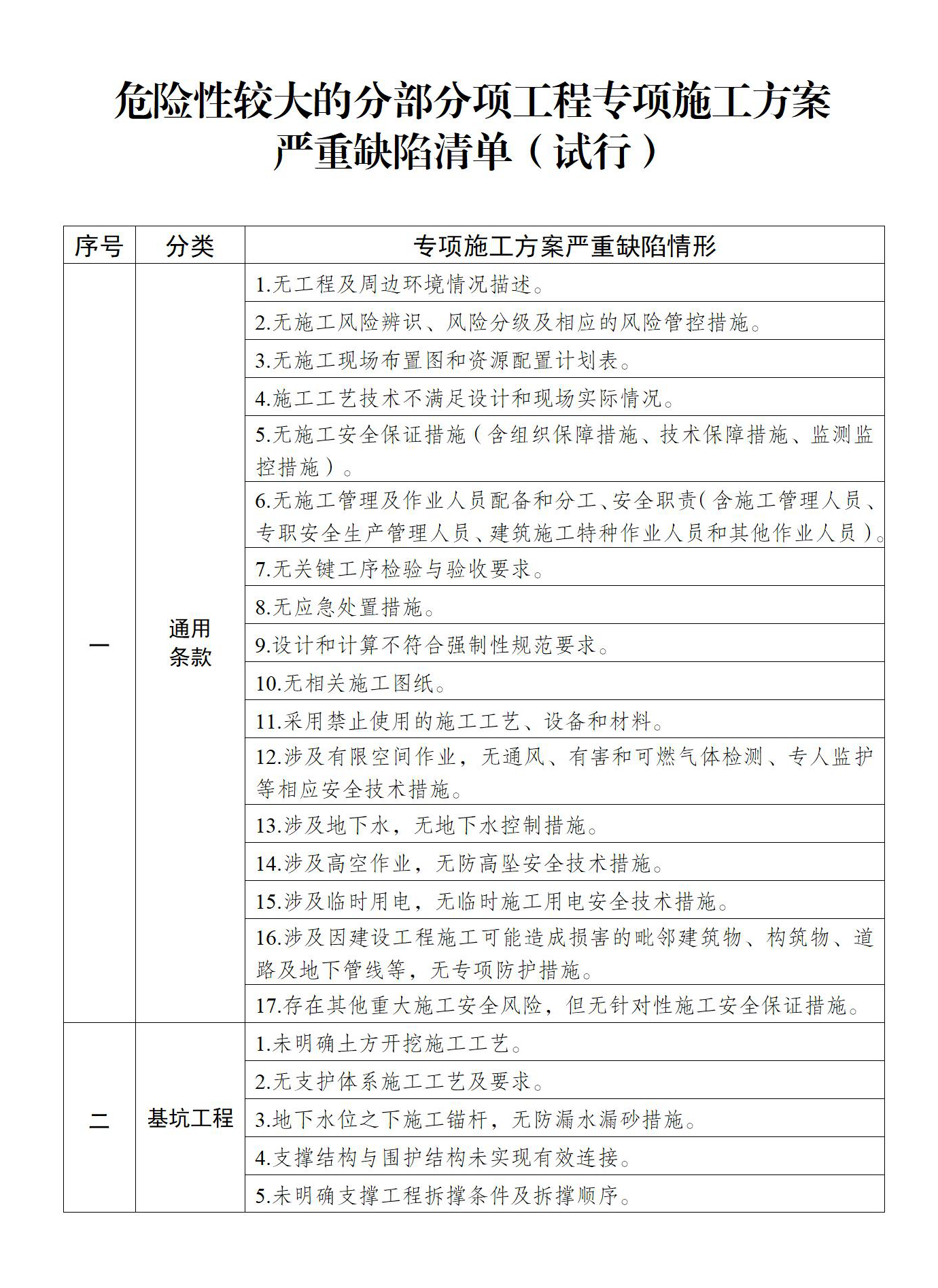 為進(jìn)一步提高危險(xiǎn)性較大的分部分項(xiàng)工程專項(xiàng)施工方案編制質(zhì)量,有效防范生產(chǎn)安全事故發(fā)生,結(jié)合施工安全實(shí)際,我部制定了《危險(xiǎn)性較大的分部分項(xiàng)工程專項(xiàng)施工方案嚴(yán)重缺陷清單(試行)》?,F(xiàn)印發(fā)給你們,請(qǐng)督促房屋市政工程各方責(zé)任主體嚴(yán)格執(zhí)行,從源頭提升建筑施工本質(zhì)安全水平。